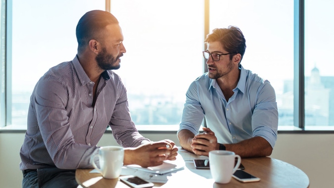 Soft and steady eye contact is the best type for a business meeting. Keep your eye contact coincidental -- information technology'south warm, connected and engaged, but it'southward non locked in. The minute you're locked into somebody, information technology feels uncomfortable and unnatural.